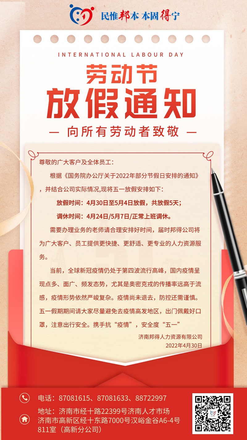 - 2024年5月濟南邦得人力資源有限公司高新分公司關于開展...